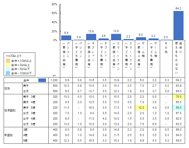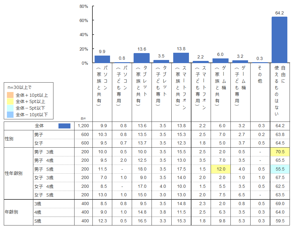 全体の平均で最も多かったのは「自由に使えるものはない」(64.2%)であった。同時に実施した小学生白書の調査結果 (「自由に使えるものはない」27.2%)と比較すると、小学生になってからデジタル機器の使用を解禁する家庭が多いようだ。使用されている通信機器を見ると、1位「スマートフォン(家族と共有)」(13.8%)、2位「タブレット(家族と共有)」(13.6%)、3位「パソコン(家族と共有)」(9.9%)となっている。子ども専用機器は家族と共有のものよりも割合が低いことから、保護者の使用している機器等を必要に応じて使用していることが多いことがわかる。年齢別に見ると3~5歳にかけて「自由に使えるものはない」割合が下がっており、年齢が上がるにしたがって通信機器を使わせる家庭が増えていくようだ