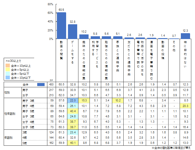幼児が通信機器を使う目的は「動画の閲覧」(60.5%)が最多であり、2位「ゲームをする」(32.8%)とは約2倍の差をつけている。また、「動画の閲覧」の割合(3歳から5歳で1.4ポイント減)には年齢ごとの変動はほぼみられないものの、年齢が上がるにつれて「ゲームをする」割合(3歳→5歳で16.7ポイント増)は急激に高まることがわかる。