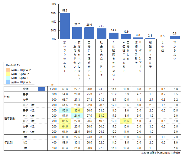 全体平均をみると、「思いやりのある子」(59.3%)を選ぶ保護者が圧倒的に多かった。2位が「友だちを大切にする子・友だちが多い子」(27.7%)という情緒面を重視した項目になっていることからもわかるように、小学校入学前の段階では心優しい子どもに育ってほしいと願っている保護者が多いことがみて取れる。