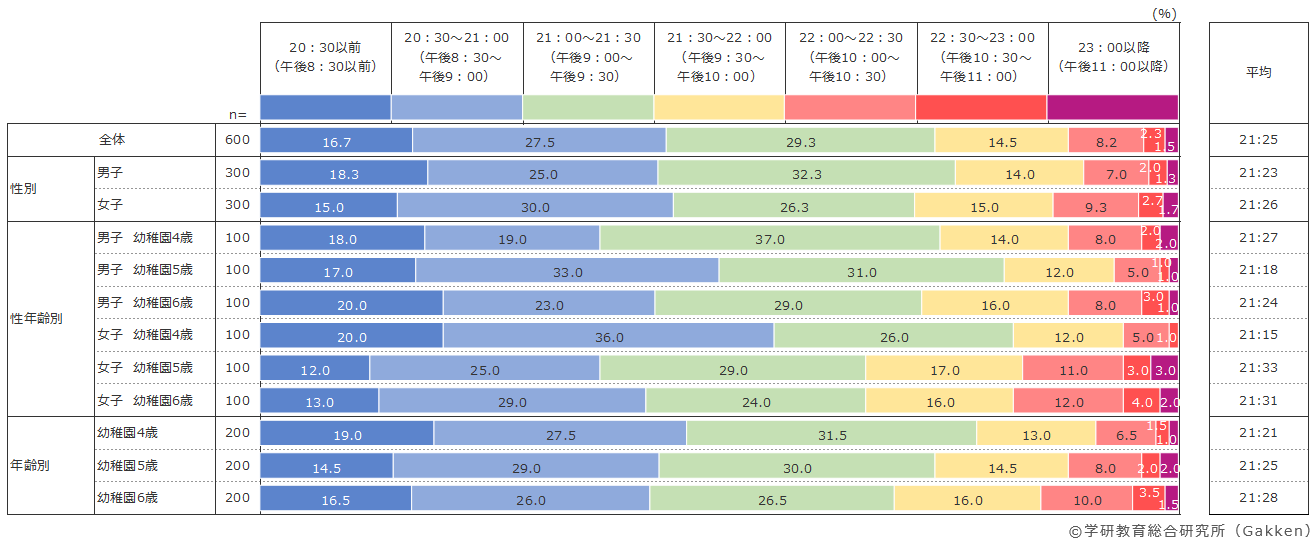 全体の平均就寝時刻を見ると、21:25に就寝していることが分かった。これは2017年度の「就寝時刻(幼稚園)」調査結果である21:12と比較すると13分遅くなっていることが分かる。