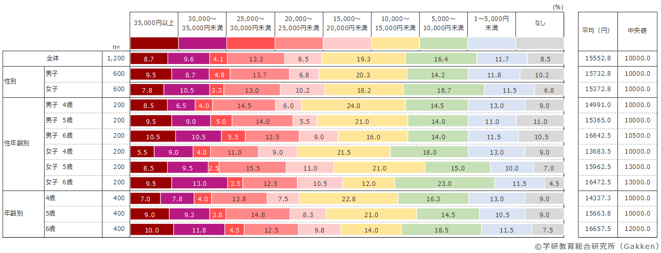 金額帯別に見ると、一番多いのが「10,000~15,000円未満」で19.3%、次いで「5,000円~10,000円未満」で16.4%、「20,000~25,000円未満」で13.3%の順となった。ただ、「なし」(=まったくもらっていない)という子どもが10人に1人弱いる一方、ほぼ同数の幼児が「35,000円以上」もらっており、その差は大きい。幼児にお金を渡すという行為について様々な考え方があることがうかがえる。