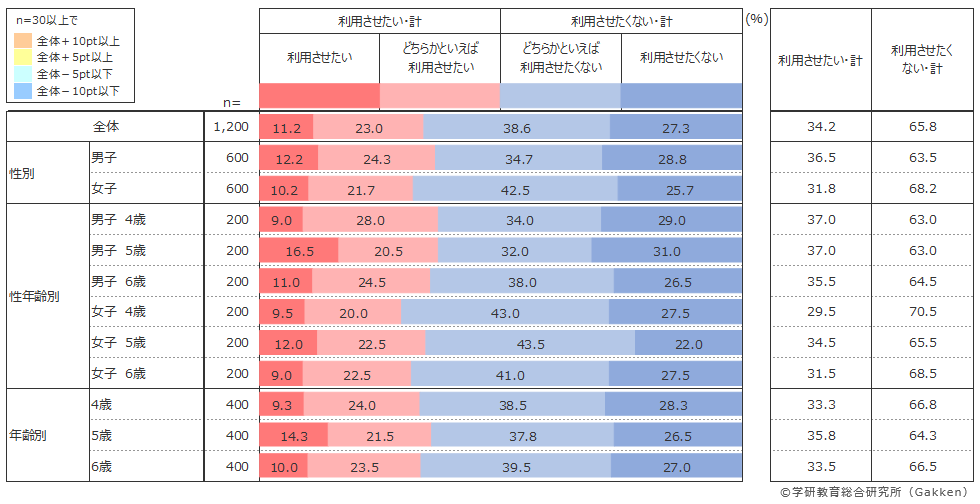最も多い意見は「どちらかといえば利用させたくない」(38.6%)だが、「利用させたくない」(27.3%)と明確な意思をもつ保護者は「利用させたい」(11.2%)と考えている保護者の2倍以上存在している。さらに、「利用させたい・計」と「利用させたくない・計」のバランスに子どもの年齢ごとの違いはほとんど見られない。