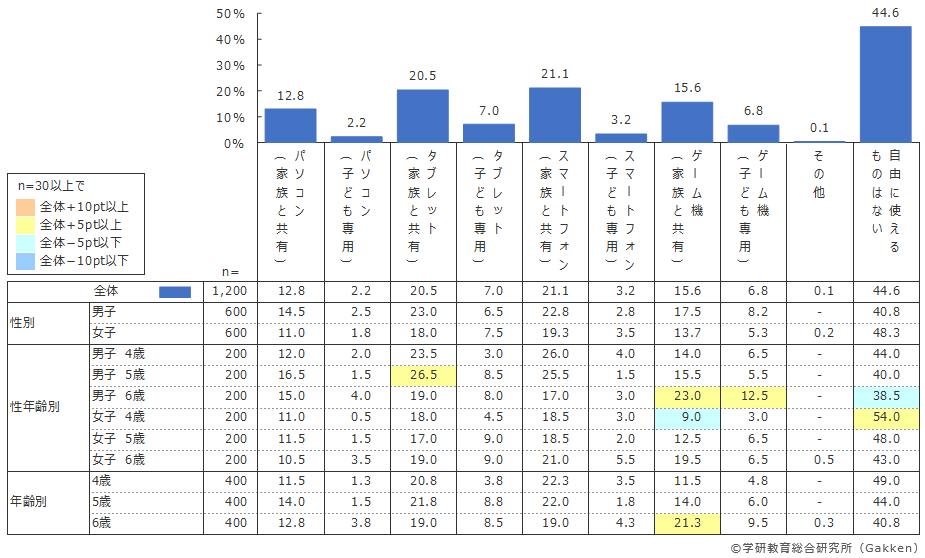 幼児が家庭内で使う通信機器について、「自由に使えるものはない」(44.6%)という結果から、およそ2人に1人が家庭内で通信機器を使っていることが分かった。
