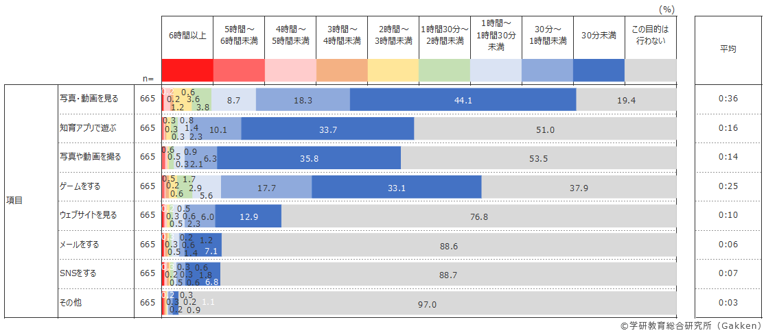 もっとも多い使用目的は「写真・動画を見る」(80.6%)で、1日平均36分を費やしていることが分かった。次いで「ゲームをする」(62.4%)が、1日平均25分であり、それに続く「知育アプリで遊ぶ」(49.0%)は1日平均16分と、遊びも学びも幼児のうちからデジタルに触れることに抵抗がないことがうかがえる。