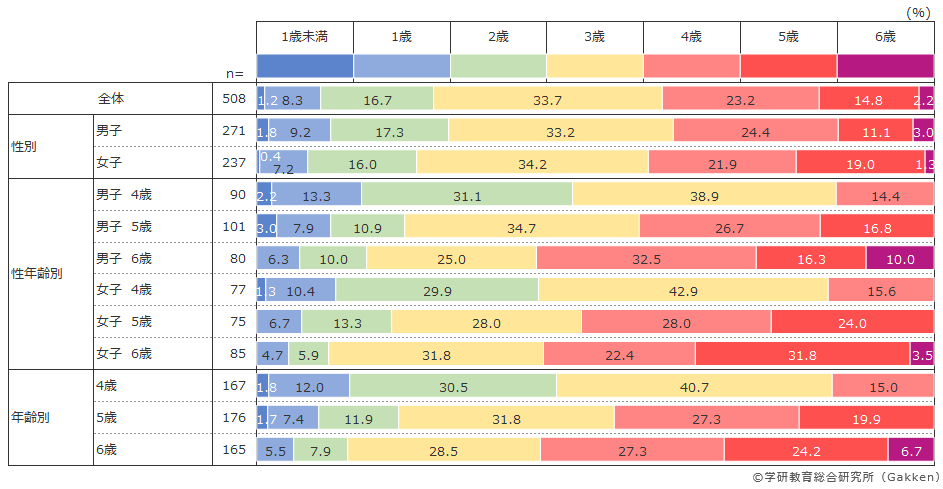 全体平均では、約6割が「3歳」までにはスマホ・タブレットに触れていることが分かった。開始年齢として集中しているのは「3歳」(33.7%)と「4歳」(23.2%)で、過半数(56.9%)の子どもがこの年齢で使用開始していることが分かる。