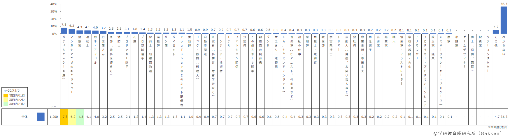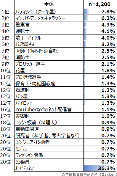 1位は『小学生白書』(2019年度調査)と同じ「パティシエ(ケーキ屋)」(7.8%)であった。女子人気が高い点も小学生と同様で、甘くて可愛らしいお菓子の作り手・売り手は、幅広い年齢の女子の心を捉えているようだ。2位「マンガやアニメのキャラクター」(6.2%)は厳密には“職業”とは言えないが、将来こうなりたい、というロールモデルとして男女共に人気であることが分かる。小学生のランキングで2位だった「YouTuberなどのネット配信者」は、小学校入学前の幼児にはそれほど人気は高くないようだ。とはいえ、小学校入学前でも「YouTuberなどのネット配信者」に憧れている子ども達が一定数いることは注目に値するだろう。
