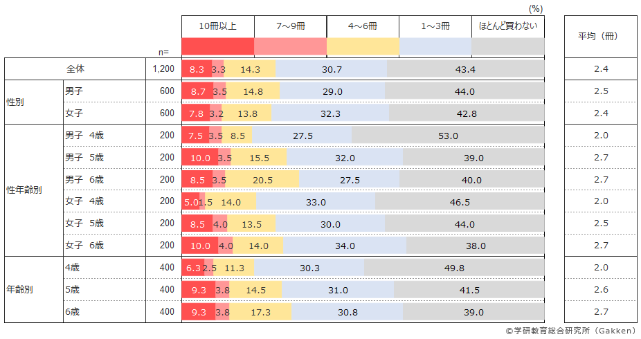 年齢別では、4歳:平均2.0冊、5歳:平均2.6冊、6歳:平均2.7冊と、年齢が上がるにつれて購入冊数が増えている。成長するにつれて子どものできることが増え、さらに小学校入学が近づくことを意識し、ワーク・ドリルを利用した家庭学習を通して学ぶ意欲や基礎学力を身に着けさせたい、という保護者の意識の高まりが現れていると推測される。このことは、「【保護者】入学前に身につけさせておきたいこと(学習面)」調査からもその一端がうかがえる。