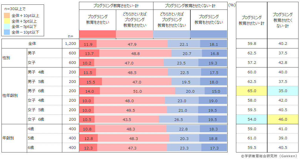 全体平均で見ると、「どちらかといえばさせたい」(47.9%)が最も多く、次いで「どちらかといえばさせたくない」が22.1%、「させたくない」が18.1%、「させたい」が11.9%となった。全体としては「どちらかといえばさせたい」「させたい」というプログラミング教育に肯定的な保護者がおよそ6割を占めた。とはいえ、積極的に「させたい」保護者よりも「させたくない」保護者の方が多いという結果となった。また、男女別で見ると、どの年齢でも男子の保護者の方が「させたい」と答えた割合が女子の保護者より少し高かった。