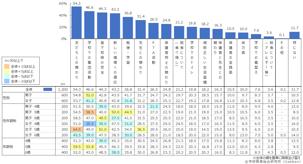 全体平均で見ると、保護者が子どもの学校入学にあたり不安に思うことの1位は「友だちとの関わり」(54.3%)、2位は「学校での集団活動」(46.6%)となり、他者との関わりに関わるものが上位であることが分かる。2017年度調査時と比較すると、「友だちとの関わり」が6.8ポイント、「学校での集団活動」が8.3ポイント上がっていることからも、保護者の不安の高まりが読み取れる。