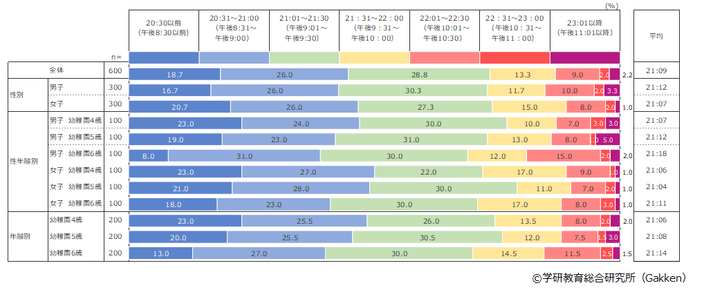 全体の平均就寝時刻を見ると、21:09に就寝していることがわかった。これは2019年の「就寝時刻(幼稚園)」調査結果である21:25と比較すると16分早くなっていることがわかる。