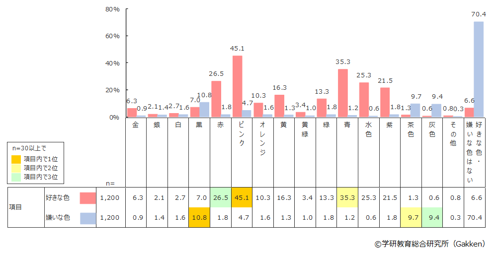 好きな色の全体平均は、前回調査である2019年調査と同様、1位「ピンク」(45.1%)、2位「青」(35.3%)、3位「赤」(26.5%)と続いた。それぞれの色について、1位「ピンク」は女子の79.3%に対して男子は10.8%、2位「青」は男子の57.5%に対して女子は13.2%、「ピンク」「青」程の差はないものの、3位の「赤」も男子が31.2%で女子が21.8%と好みが分かれた。男女別で見ると、男子の1位は「青」(57.5%)、2位「赤」(31.2%)、3位「緑」(20.3%)であるのに対し、女子の1位は「ピンク」(79.3%)、2位「紫」(37.0%)、3位「水色」(34.8%)と、それぞれ異なるラインナップとなった。