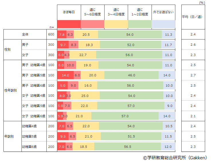 全体で約9割が外で遊ぶと答えており、1位「週に1~2日程度」(54%)、2位「週に3~4日程度」(20.5%)、3位「外で遊ばない」(11.3%)4位「ほぼ毎日」(7.8%)となった。また、幼稚園児たちは平均して1週間に2.4日程度、外で遊んでいることもわかった。