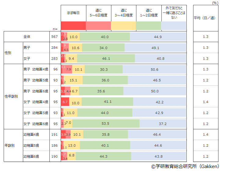 幼稚園児は、外で友だちと遊ぶ機会はどの程度あるのだろうか。
