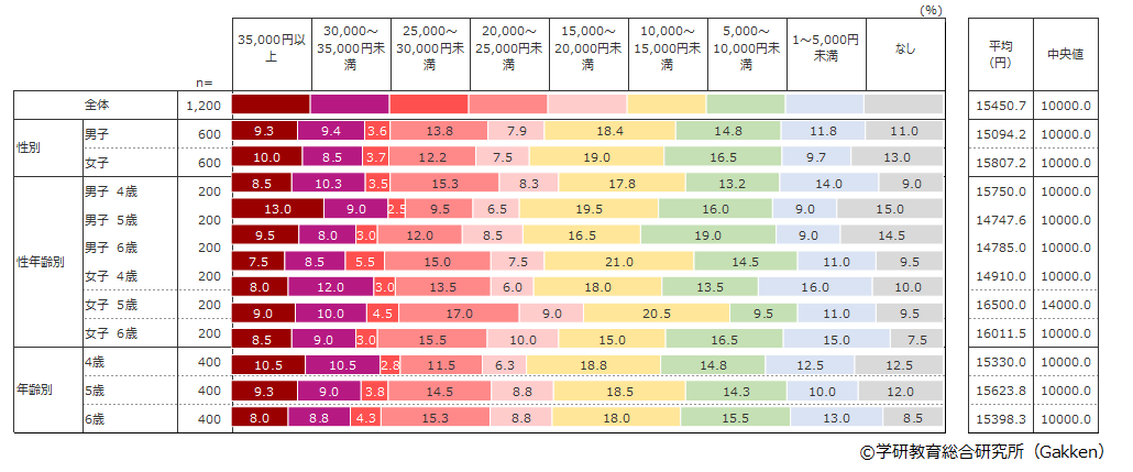 2022年調査において、35,000円以上の高額をもらっているのは4歳児が最も多いという結果になっている。2019年調査では6歳児が35,000円以上の高額をもらっているという結果だったのが、2022年では逆の結果になっていることが興味深い。
