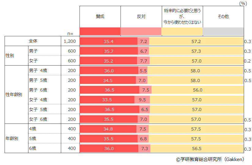 全体を通じて1位は「将来的に必要だと思うが、今から使わせたくはない」(57.2%)が半数を超え、2位「賛成」(35.4%)、3位「反対」(7.2%)となった。この割合は、男女や年齢別で大きな違いはない。