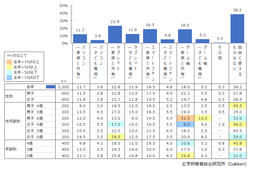 3年前(2019年)と5年前(2017年)の調査で「自由に使えるものはない」と回答した家庭の割合はそれぞれ44.6%と64.2%であり、幼児に通信機器を自由に使わせる家庭の割合は増加傾向である。特に「子ども専用」の通信機器に着目すると、2017年からの5年間でタブレット利用は3.5%から11.9%へ8.4ポイント増加していて、同じ期間のパソコン利用は0.8%から3.8%への3.0ポイント増、スマートフォン利用は2.2%から4.8%への2.6ポイント増、そしてゲーム機利用は3.2%から5.2%への2.0ポイント増と比較しても、「子ども専用」の通信機器にタブレットを選ぶ家庭の増加が際立っている。