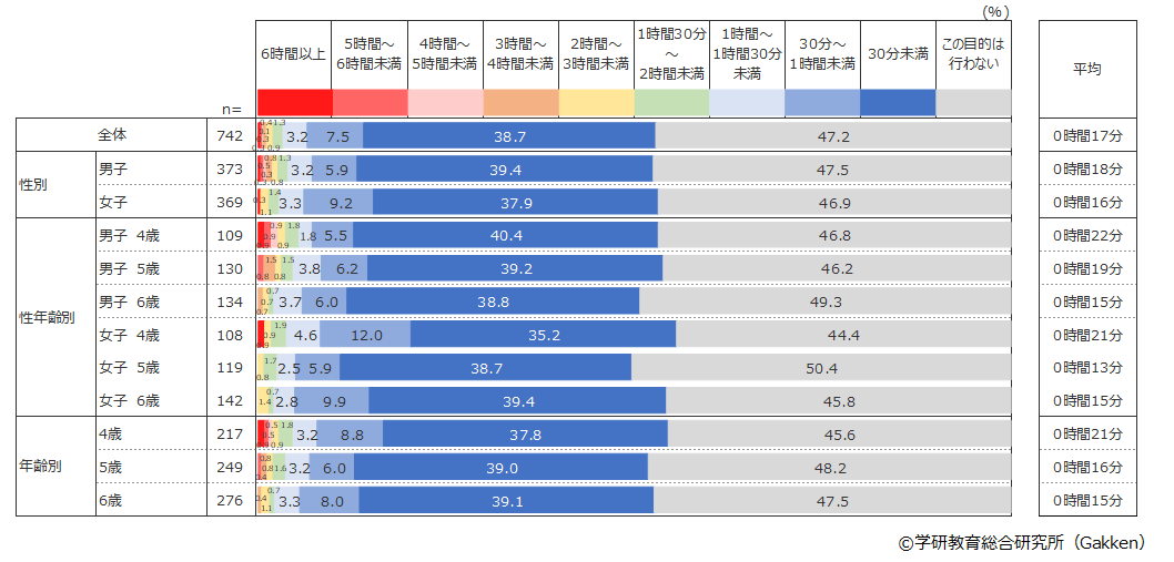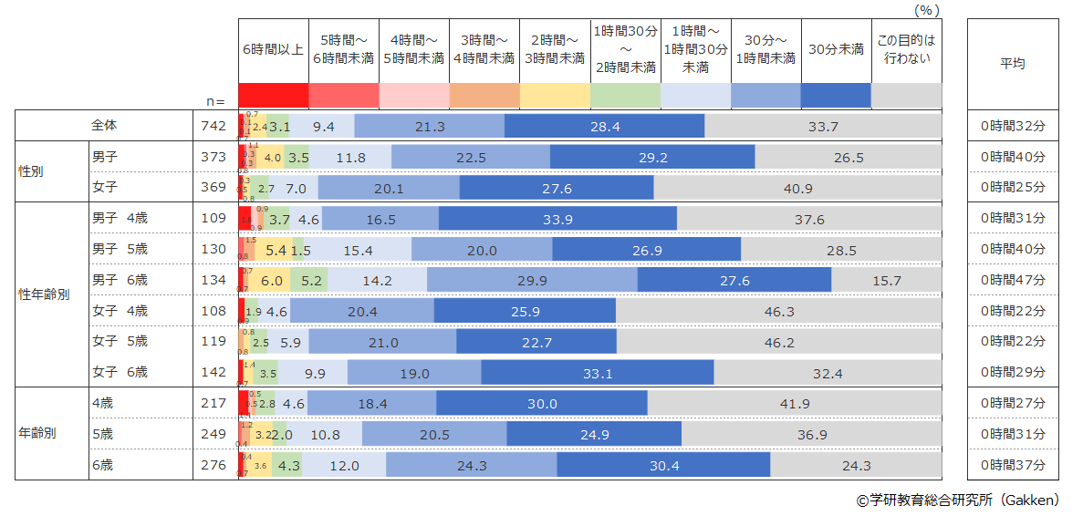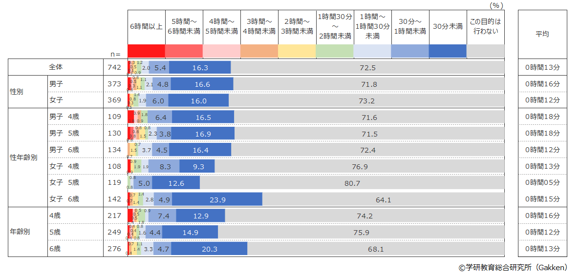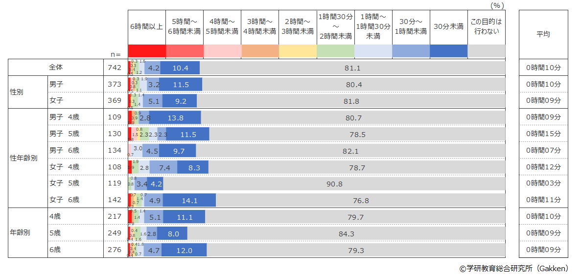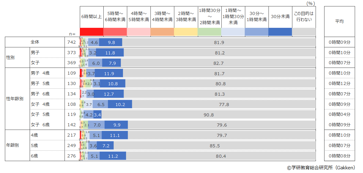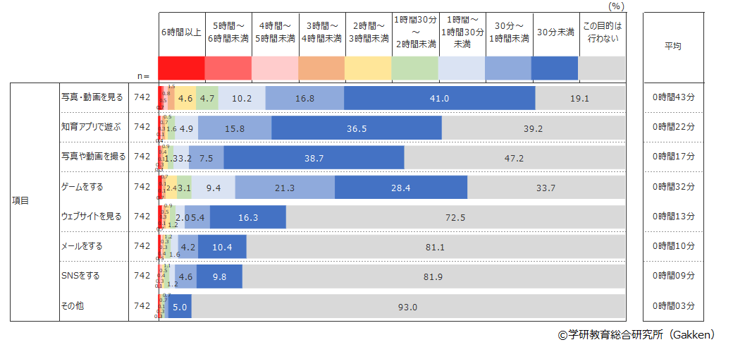 最も多い使用目的は「写真・動画を見る」(80.9%)で1日平均43分を費やしていて、2番目は「ゲームをする」(66.3%)で1日平均32分、3番目は「知育アプリで遊ぶ」(52.8%)で1日平均22分だった。3年前(2019年)の調査でもこの順位は同じであったが、それぞれに費やす時間は3年前は「写真・動画を見る」1日平均36分、「ゲームをする」25分、「知育アプリで遊ぶ」16分で、いずれの目的でも使用時間が伸びている結果となった。4番目以降の使用目的でも同じように利用時間が長くなる傾向がみられ、幼児が自由に通信機器を使える家庭の割合が増えているだけでなく、幼児が通信機器を利用する時間も全般的に長くなっていることが分かった。