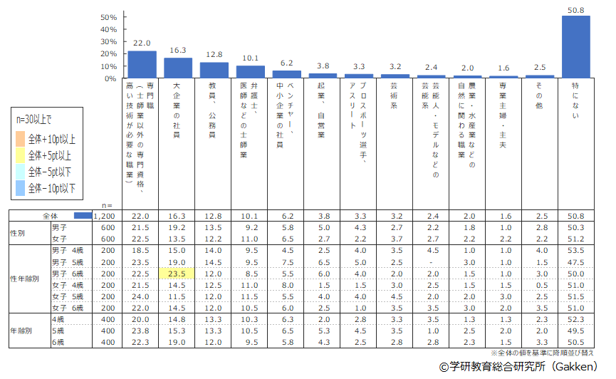 全体平均は、「特にない」が50.8%と最も高かった。具体的な職でランキングを見ると1位「専門職」(22.0%)、2位「大企業の社員」(16.3%)、3位「教員・公務員」(12.8%という結果であった。4位には「弁護士・医師などの士師業」(10.1%)が挙がり、1位の「専門職」を合わせると32.1%で、専門資格や高い技術が必要とされる仕事への期待が高いことがうかがえる結果となった。