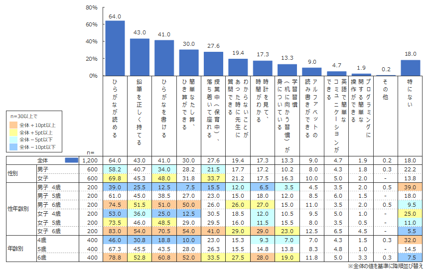 「すでに身につけていること(学習面)」の上位は、「【保護者】入学前に子どもに身につけさせておきたいこと(学習面)」と同じく、「ひらがなが読める」(64.0%)だった。 次いで「鉛筆を正しく持てる」(43.0%)、「ひらがなが書ける」(41.0%)であり、読み書きに関する能力の習得に高い関心を持ち、家庭でも取り組んでいる傾向がわかる。