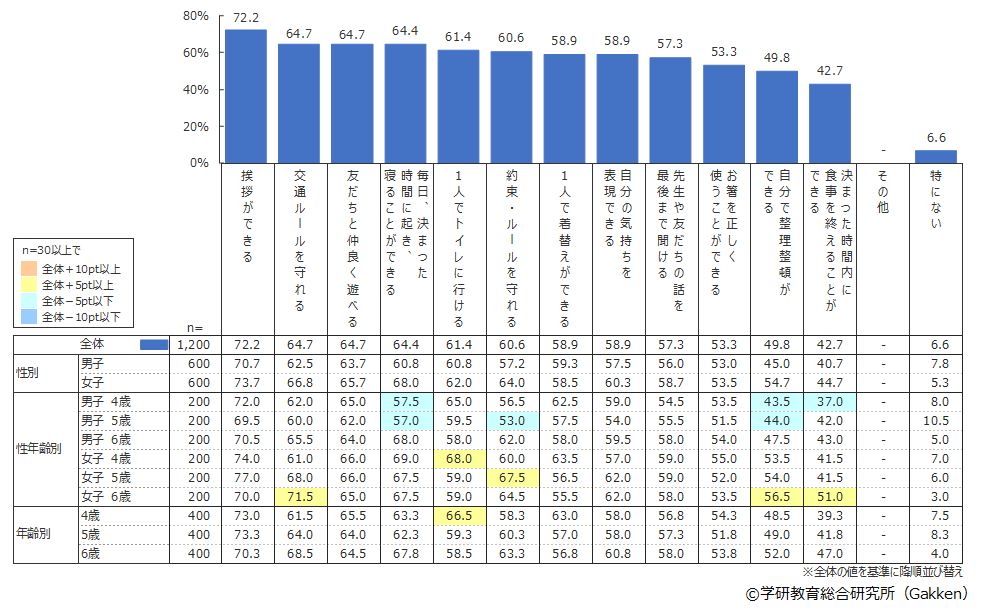 全体をみると1位は「挨拶ができる」(72.2%)であり、2017年、2019年に続き、生活面で最も身につけて欲しい項目であった。円滑なコミュニケーションの第一歩として「挨拶ができる」ことを幼児期から習慣づけたいと考える保護者の思いがみられる。