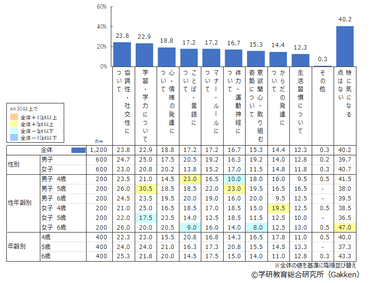 「特に気になる点はない」と回答したのは40.2%であり、過半数の保護者は同年代の子どもたちと自分の子どもを比べたとき、気になることがあるようだ。全体では「協調性・社交性について」が1位で、その後は「学習・学力について」「心・情緒の発達について」と続く。ただ、どの回答もそれほど大きな差はなく、保護者の悩みは十人十色のようだ。