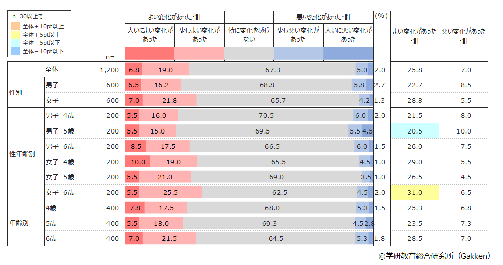 残りのおよそ3分の1の保護者がコロナ前からの変化を感じている。変化を感じた保護者の中では「よい変化」と感じた保護者が多く、25.8%と全体のおよそ4分の1になった。大いによい変化を感じた保護者も6.8%いる。年齢の差はあまり見られないが、男児女児を比べると女児の保護者の方がよい変化という回答が多く、その差は6.1ポイントにもなる。一方で悪い変化があったと回答した保護者は7.0%。こちらは男児の保護者が3.0ポイント高い。