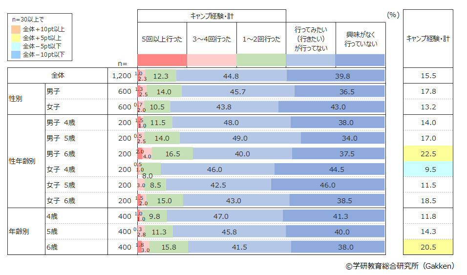 この1年間にキャンプを1回以上体験した幼児は全体で15.5%だった。男女差を見ると男子が17.8%、女子が13.2%と男子が4.6ポイント高い。年齢別では4歳11.8%、5歳14.3%、6歳20.5%と年齢が上がるほど増えている。同じく小学生での「キャンプ体験」の調査では小学生全体で17.4%なので、小学生と比較すると1.9ポイント少ない。