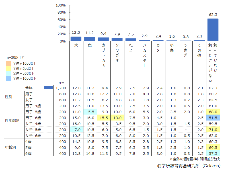 全体で見ると、1位は「犬」、2位は「魚」、3位は「カブトムシ」である。上位3位までを同じく小学生のデータと比較すると、1位と2位が入れ替わっただけという結果で、子どもの飼っている生き物のおおまかな傾向は変わらないといえる。