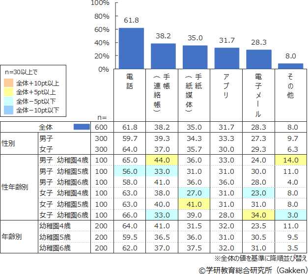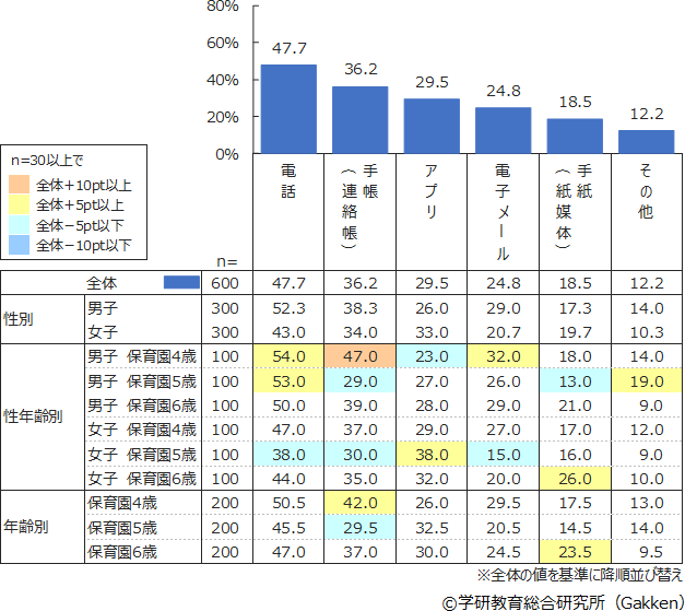 全体平均を見ると、幼稚園は1位「電話」(61.8%)、2位「手帳(連絡帳)」(38.2%)、3位「手紙(紙媒体)」(35.0%)。保育園は1位「電話」(47.7%)、2位「手帳(連絡帳)」(36.2%)、3位「アプリ」(29.5%)という結果となった。