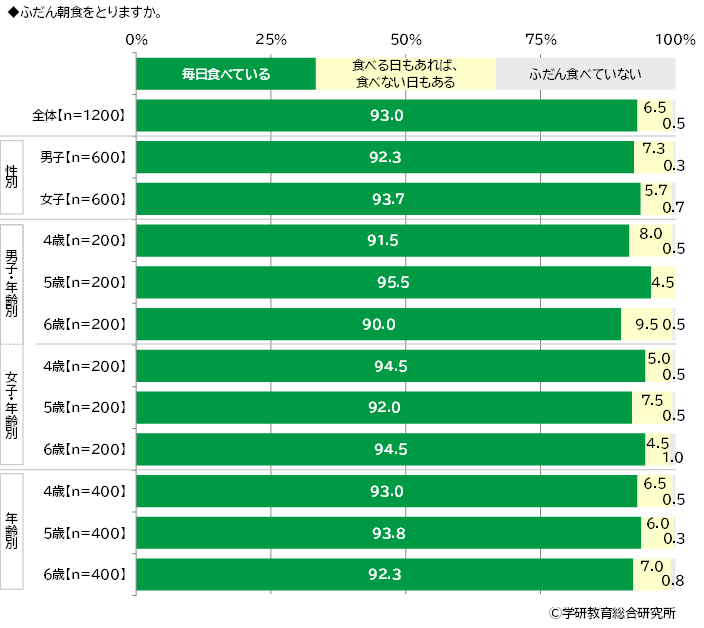 ふだん朝食をとるかをきいたところ、「毎日食べている」が93.0%、「食べる日もあれば、食べない日もある」が6.5%、「ふだん食べていない」が0.5%となり、大多数が朝食を毎日食べていることがわかりました。 男女・年齢別にみると、「毎日食べている」が最も高くなったのは5歳の男子で、95.5%でした。