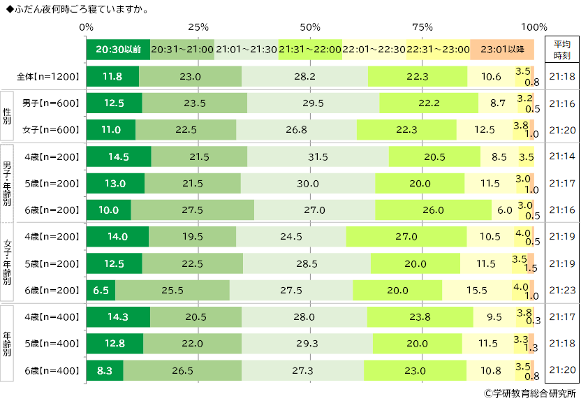 男女・年齢別にみると、最も遅かったのは6歳の女子で、平均時刻は21:23となりました。
