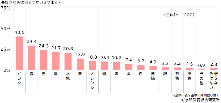 好きな色をきいたところ、1位「ピンク」(40.5%)、2位「青」(29.4%)、3位「赤」(24.3%)となりました。