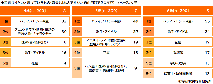 女子について、年齢別にみると、4歳では「アニメ・ドラマ・映画・童話の登場人物・キャラクター」、5歳と6歳では「歌手・アイドル」が2位でした。また、4歳では「医師(歯科医師含む)」、6歳では「看護師」が3位に挙がりました。