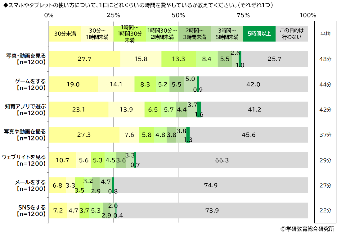 スマホやタブレットの使い方について、どのようなことに、どのくらいの時間を費やしているかをきいたところ、「写真・動画を見る」が最も長く、平均は48分となりました。以下、「ゲームをする」44分、「知育アプリで遊ぶ」42分、「写真や動画を撮る」37分、「ウェブサイトを見る」29分、「メールをする」27分、「SNSをする」22分と続きました。また、行っている割合は、「写真・動画を見る」が74.3%(「この目的は行わない」が25.7%)で最も高くなり、「知育アプリで遊ぶ」(58.8%)、「ゲームをする」(58.0%)が続きました。