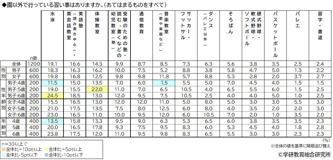 男女別にみると、男子・女子ともに1位「水泳」、2位「英語塾(読み書き中心)・英会話教室」、3位「体操教室」となりました。