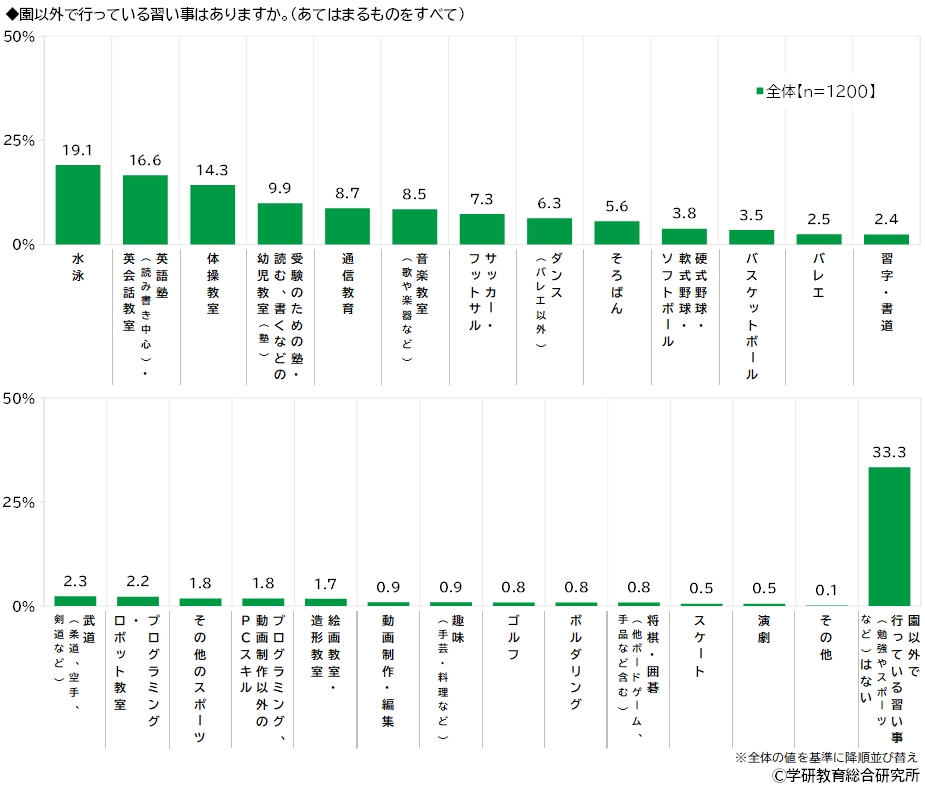 園以外で行っている習い事をきいたところ、1位「水泳」(19.1%)、2位「英語塾(読み書き中心)・英会話教室」(16.6%)、3位「体操教室」(14.3%)、4位「受験のための塾・読む、書くなどの幼児教室(塾)」(9.9%)、5位「通信教育」(8.7%)となりました。また、「園以外で行っている習い事(勉強やスポーツなど)はない」は33.3%でした。