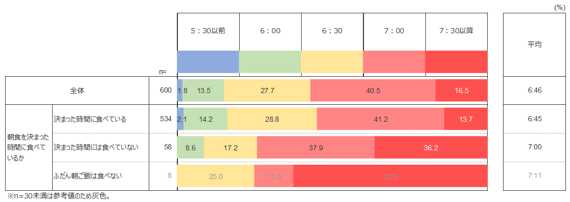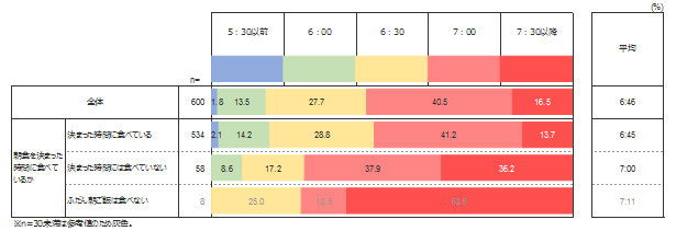 その結果として、「決まった時間に食べている」子どもと「決まった時間には食べていない」子どもに共通してみられるのは、7:00起床の割合が最も高いということである。一方で、前者においては6:30起床の割合が全体の3割弱を占め、2番目に高い。後者は7:30以降の起床が2番目に高いが、7:00起床の割合との差はわずか1.7%である。そして「ふだん朝ごはんを食べない」子どもの約6割は7:30以降に起床している。起床時刻が遅いほど、朝ごはんを食べない傾向にあるようだ。