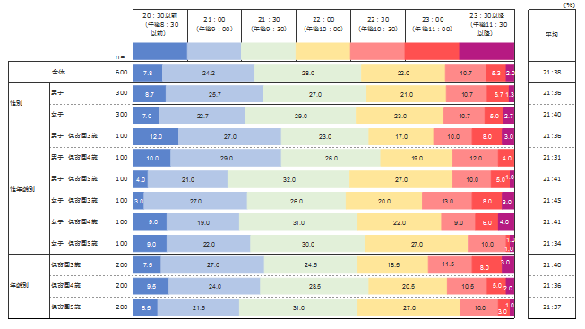 平均就寝時刻で見ると、多くが21:34~21:45の間に就寝していることがわかり、幼稚園の子どもたちに比べやや遅い。また全体の就寝時刻の内訳を見ると、21:30が最も多いが、22時以降に就寝している割合は全体の4割を占める。また、21:30までに寝ている子どもの割合は全体の約3割であり、幼稚園の子どもたちに比べて低いことがわかる。この点については家族の就業状況等を含めた生活リズムが関係していることが考えられるため、引き続き調査を行っていく予定である。