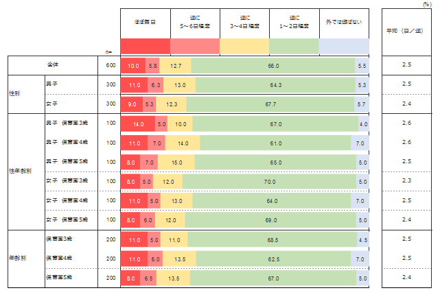 全年齢で9割以上が外で遊ぶと答えており、1位は「週に1~2日程度」(66.0%)、2位「週に3~4日程度」(12.7%)、3位「ほぼ毎日」(10.0%)となった。また、子どもたちは平均して1週間のうち約2.5日は外で遊んでいることもわかった。