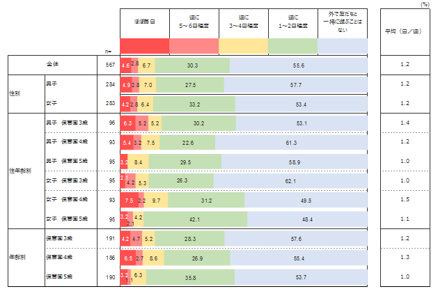 全体平均では、「外で友だちと一緒に遊ぶことはない」(55.6%)が最も多く、2位「週に1~2日程度」(30.3%)、3位「週に3~4日程度」(6.7%)となり、子どもたちは1週間で平均1.2日程度、外で友だちと遊んでいることがわかった。半数以上(55.6%)の子どもが「外で友だちと一緒に遊ぶことはない」と回答している。