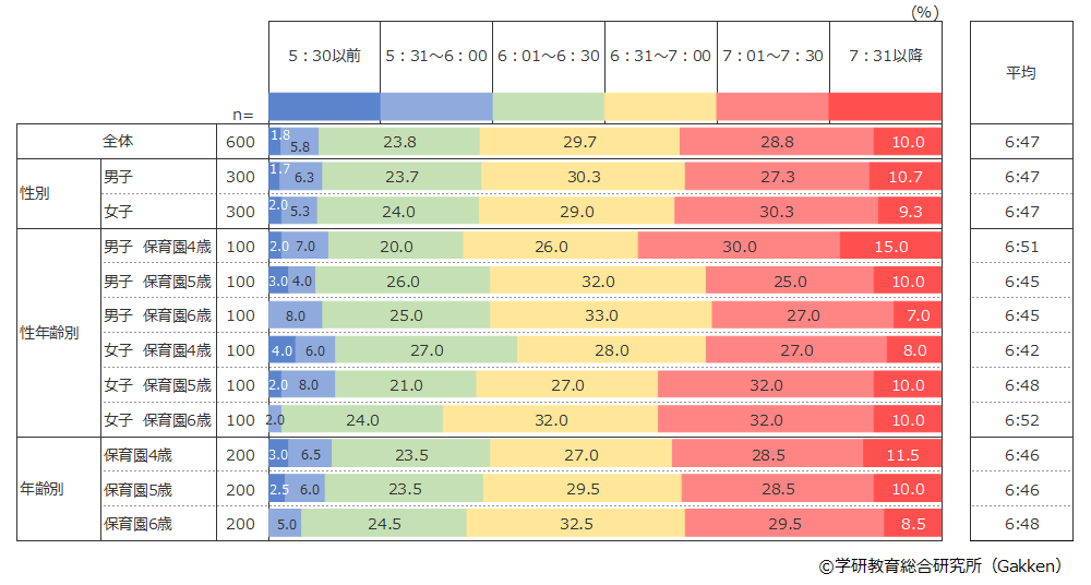 全体では6:31~7:00に起きる割合が29.7%と高く、次に7:01~7:30が28.8%で、全体の約6割が6:31~7:30の間に起床しているという結果になった。5:30以前に起きる割合は非常に低いが、幼稚園に通う幼児よりは若干高いポイントが出ている。また、6:00までに起きること割合も非常に少ないが、5:30以前同様、幼稚園に通う幼児よりもポイントは高く出ている。