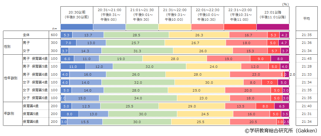 全体の平均就寝時刻は21:35であり、2019年の「就寝時刻(保育園)」調査結果である21:48と比較すると、13分早くなっていることがわかる。2022年の「就寝時間(幼稚園)」と比べると、保育園児の方が幼稚園児よりも26分寝るのが遅い。